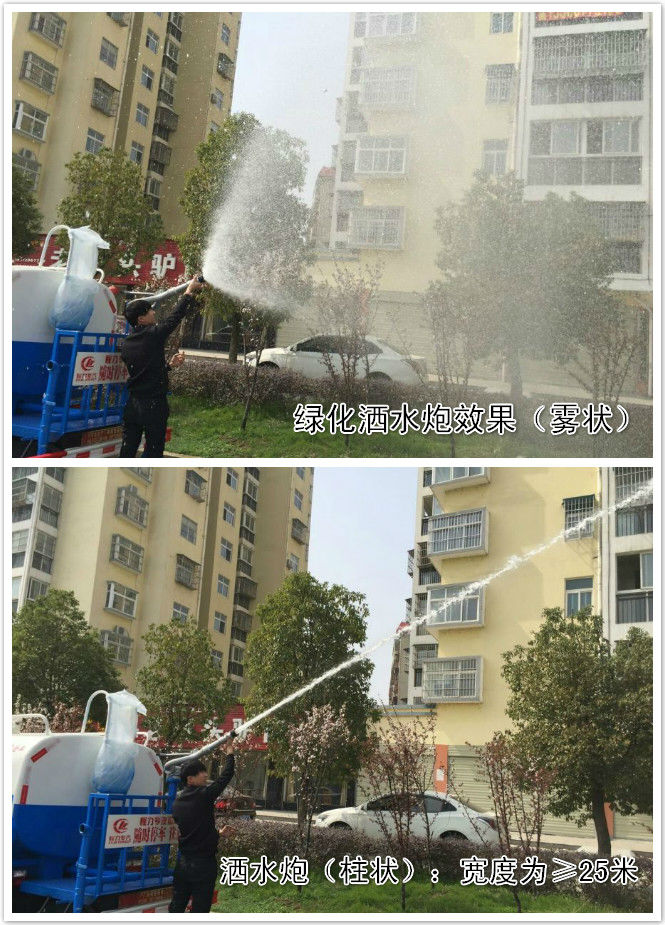 5、湖北程力灑水車前噴頭位置較低,靠近地面,噴灑壓力較大,可用于沖洗路面;后噴頭位置較高(灑水車后噴頭一般左右各安裝一個),灑水面較寬,可用于公路施工灑水,使用后噴頭時,應將前噴管關閉;使用可調噴頭灑水時,灑水寬度可根據需要調整。灑水寬度越寬,中間重疊量越少,灑水密度越均勻。