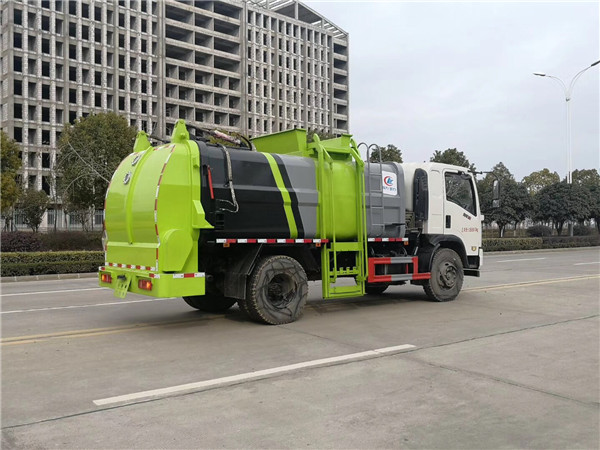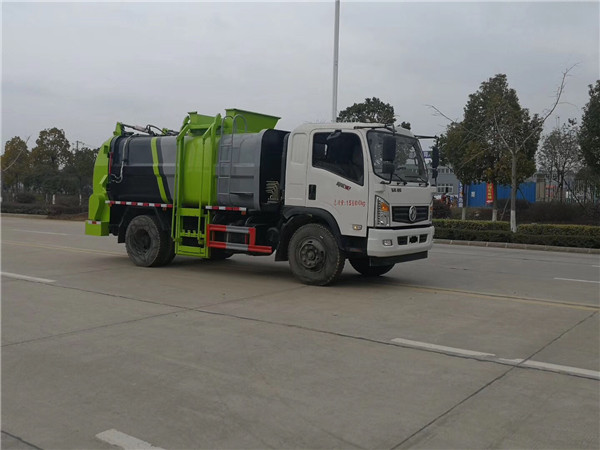 先進的電控系統 采用進口PLC(可編程序控制器)集成控制,控制電路在PLC內生成,采用邏輯回路保證各操作指令按順序執行,同時保證各操作指令之間互鎖,外部只有線路連接,降低了故障發生率,避免了誤操作造成的事故,提高了可靠性;特別設置的緊急制動按鈕可使餐廚垃圾壓填機構在任何狀態或任何位置停止,保障作業人員、設備的安全;方便的操作控制 作業控制盒分別安裝在駕駛室內和車尾,駕駛室內的作業控制盒可控制推擠卸料和選擇操作模式(如自動或手動),車尾的作業控制盒則控制壓填機構和翻桶機構的作業,使用操作十分方便。特別是在垃圾填埋場,作業人員無須下車即可完成卸料和污水排放??筛鶕脩粢筮x裝有線遙控裝置;多種翻桶(斗)機構 不同用戶可根據不同的餐廚垃圾搜集方式,選裝不同的翻桶(斗)機構:翻標準餐廚垃圾鐵桶ZBT59003-88(300升)、塑料餐廚垃圾桶(240升)、隨車小餐廚垃圾斗(800升)、密封遮式餐廚垃圾斗(1400升)、大餐廚垃圾斗(3350升)。
