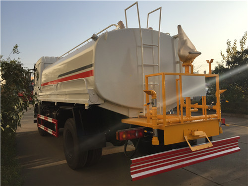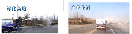 灑水車前裝有鴨形噴嘴或圓頭沖嘴,后面裝有圓柱開(kāi)灑水噴嘴或蓮蓬頭噴嘴,后部有一工作平臺(tái),裝配有水炮。后部還可裝8個(gè)噴嘴(選裝)噴水器一般用于沖洗街道,起除塵和降溫作用,其噴水器可以用調(diào)節(jié)噴嘴螺紋的方法改變噴水器的噴灑方向和角度,高射水炮可以用于城鄉(xiāng)園林綠化及應(yīng)急消防。蓮蓬嘴可以澆落路中間噴水器沖起的灰塵,起到清潔空氣的作用。