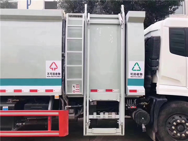 另外餐廚垃圾車與壓縮式垃圾車的結構體為:推板壓縮,掛桶側裝,垃圾站對接,垃圾自卸裝置。通過拉桿提升垃圾桶自動倒入垃圾,并往車廂后方推動擠壓垃圾,達到壓縮垃圾的目的,壓縮原理是采用機、電、液壓聯動控制系統、電腦控制及手動操作系統,通過填裝器和推鏟等裝置實現垃圾倒入,壓碎或壓扁,并將垃圾擠入車廂并壓實和推卸;從而實現對接壓縮垃圾車塊轉運運輸功能等。