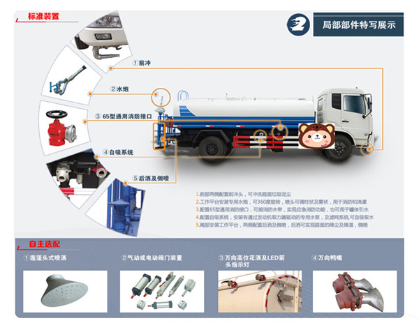 東風天錦灑水車:該車采用東風康明斯180馬力、190馬力發動機,罐體有效容積8-13噸,帶國家免征公告。