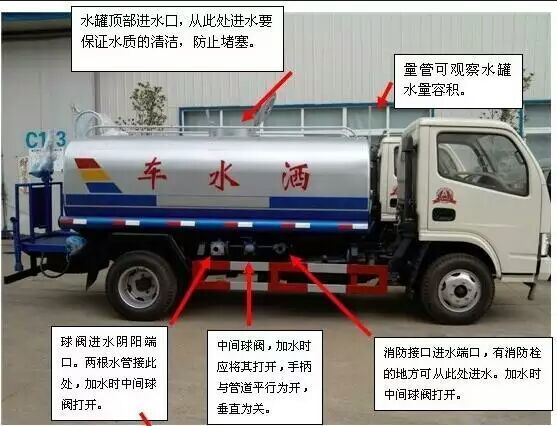 灑水車前裝有鴨形噴嘴或圓頭沖嘴,后面裝有圓柱開灑水噴嘴或蓮蓬頭噴嘴,后部有一工作平臺,裝配有水炮。后部還可裝8個噴嘴(選裝)噴水器一般用于沖洗街道,起除塵和降溫作用,其噴水器可以用調節噴嘴螺紋的方法改變噴水器的噴灑方向和角度,高射水炮可以用于城鄉園林綠化及應急消防。蓮蓬嘴可以澆落路中間噴水器沖起的灰塵,起到清潔空氣的作用。