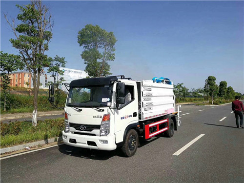 3、側噴、后灑――位于抑塵車后工作平臺左右兩側,側噴,即向側面噴灑的裝置,后灑,則是向后部噴灑的裝置,兩者水流形態都呈扇形,常用于道路壓塵降溫加濕,噴出的水薄而均勻,可避免噴灑后污水橫流的現象。