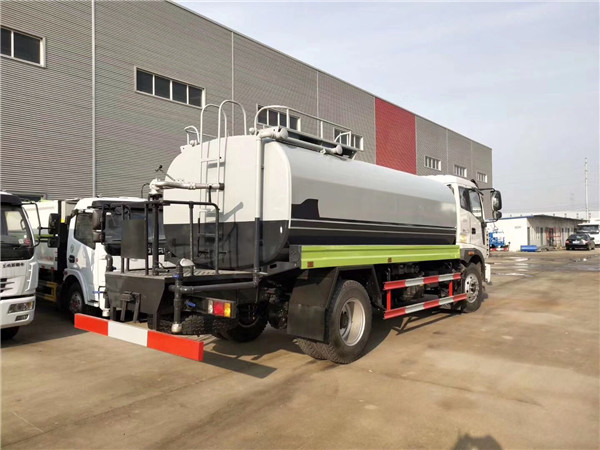 原廠灑水車上裝配置:罐體容積為15立方灑水車,罐體鋼板為4mm碳鋼Q235材質,罐內隔板具有防波作用,以減輕汽車行駛時罐體液體沖擊,罐體及整車外形尺寸按照公告。帶大功率專用灑水泵,泵可自吸自排,整車前沖、后灑、側噴、帶65消防接口,后平臺帶綠化灑水炮,灑水炮可全方位旋轉,可連續調成直沖狀、大雨、小雨、毛毛雨;前封頭帶水位計,后平臺主管路帶1寸澆花接口,后爬梯。平臺后部帶小安全告知牌:“隨時停車,注意安全”,帶兩根水管及陰陽端。罐體顏色:上白/下藍,銀灰/銀藍,罐體兩側噴“灑水車、綠化噴灑車”字樣,貼反光標示。