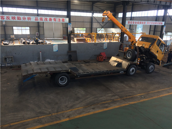 東風前四后八凹梁隨車吊,前四后八凹梁隨車吊采用凹梁下沉結構好處在于平板離地高度低重心穩,專利凹式設計,凹梁式隨車吊平板車,凹式隨車吊平板車,主要用于30噸左右挖掘機運輸,裝載機運輸,收割機運輸,壓路機運輸等工程機械和不可拆卸物體的運,本產品是我們廠家專利產品,全國有此公告僅此一款,缺點在于凹梁設計易斷大梁和前方向拐臂,采用TT530豪華活D913駕駛室,玉柴310馬力國五發動機,5.5噸前橋13噸后橋,法士特10檔變速箱,10.00R20鋼絲胎,方向助力、斷氣剎、abs防抱死、空調,總質量31噸,上戶噸位18.45噸,車身自重12.35噸,標準型上裝橫梁采用12*12規格6mm厚方鋼,整根貫穿式設計,保證承載性能,貨箱平板10mm厚花紋板;重載型上裝橫梁采用12*10規格8mm厚方鋼,整根貫穿式設計,承載性能更好,貨箱平板8mm厚花紋板,爬梯采用重載加強型設計,采用三道筋雙簧加固處理,帶有后支腿,平板帶有斜支撐,貨箱平板可以伸縮,伸出3米,縮回2.5米,是運輸30噸-40噸大型挖掘機、大型工程機械等最理想的拖車。