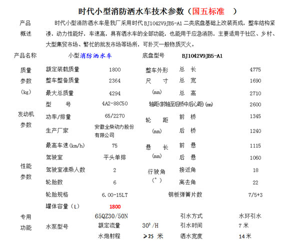 采用東風多利卡底盤EQ1110TFJ,單排或排半駕駛室,配備朝柴120馬力國五發(fā)動機,825-16輪胎,外形尺寸7650×2300×3170(mm),消防泵后置帶卷簾門,水罐容積6.5立方米,東風消防水車配備20或30消防泵和消防炮,射程≥45米,消防灑水車可用于森林消防滅火,社區(qū),村鎮(zhèn)等一般性消防戰(zhàn)備滅火,同時也可以用于綠化灑水,抗旱供水運水等。該車罐體有效容積:6噸-8噸,該車帶國家免征公告。帶專用灑水泵,可自吸自排,帶前沖后灑,側噴,后工作平臺上配灑水高炮.