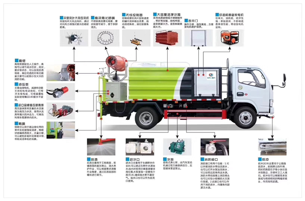 3、側(cè)噴、后灑――位于抑塵車后工作平臺(tái)左右兩側(cè),側(cè)噴,即向側(cè)面噴灑的裝置,后灑,則是向后部噴灑的裝置,兩者水流形態(tài)都呈扇形,常用于道路壓塵降溫加濕,噴出的水薄而均勻,可避免噴灑后污水橫流的現(xiàn)象。