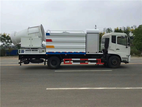 東風12噸抑塵車選配50米噴霧機達到除塵效果。霧炮機是根據風送原理,先使用進口高壓泵、微細霧化噴嘴將水霧化,再利用風機風量和風壓將霧化后的水霧送到較遠距離,使得水霧到達較遠距離同時能夠覆蓋更大面積,水霧與粉塵凝結后降落,從而達到降塵目的。