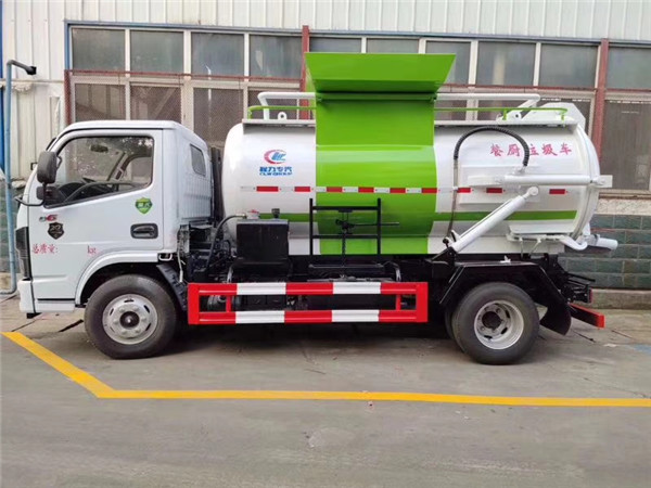 餐廚垃圾車裝載量大,例如5方餐廚垃圾車和5方的掛桶垃圾車,掛桶垃圾車最多只能裝5方左右,而餐廚垃圾車通過壓縮功能,能裝大概裝12方左右的垃圾,優勢顯而易見。
