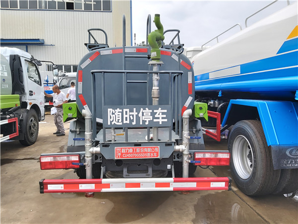 小多利卡5方灑水車(罐體容積:5立方):該車采用東風朝陽柴油發動機,一汽錫柴柴油發動機和昆明云內柴油發動機,白色前翻駕駛室,7.00-16輪胎,汽剎, 5檔變速箱,2噸前橋,4噸后橋,整車外形尺寸:長×寬×高(mm) 5990/1980/2390,總質量(kg)7360,額載質量(kg)3870。罐體有效容積:5噸,帶國家免征公告。