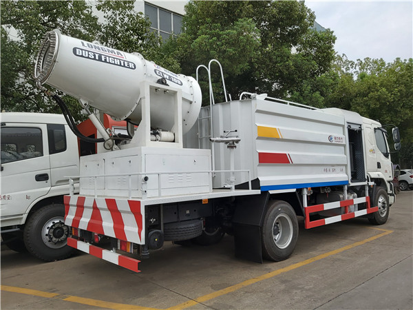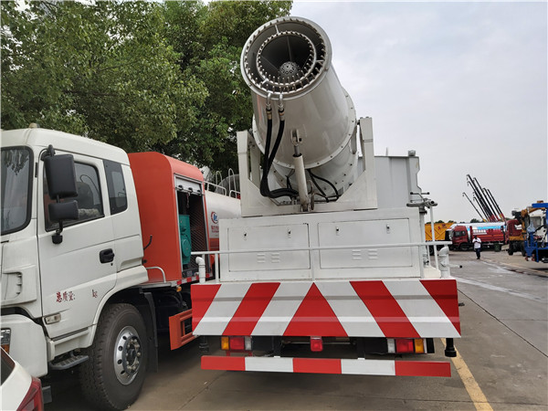 東風柳汽多功能抑塵車后工作平臺安裝高射程低量風送噴霧機,該噴霧機是一種車載可分離式風送機動噴霧機,噴霧機自身有完整的發電機組、風送系統、控制系統、專用噴藥風機、風炮等設備組成。可以駕駛室內或駕駛室處遙控操作,也可手動操作,一邊行駛一邊進行噴霧施藥,可360度旋轉,噴藥、抑塵霧化效果好,射程遠。