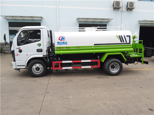小多利卡5方灑水車(罐體容積:5立方):該車采用東風朝陽柴油發動機,一汽錫柴柴油發動機和昆明云內柴油發動機,白色前翻駕駛室,7.00-16輪胎,汽剎, 5檔變速箱,2噸前橋,4噸后橋,整車外形尺寸:長×寬×高(mm) 5990/1980/2390,總質量(kg)7360,額載質量(kg)3870。罐體有效容積:5噸,帶國家免征公告。