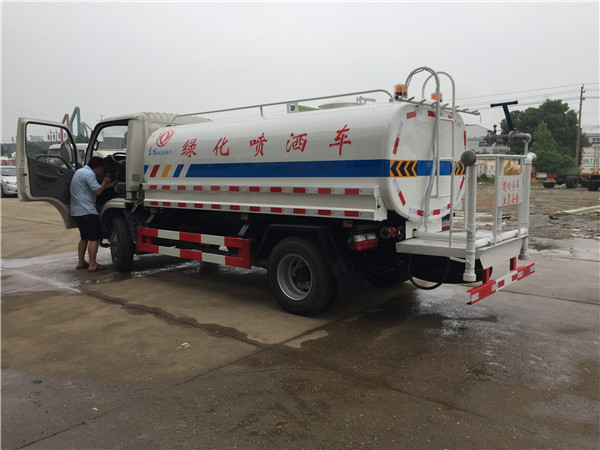 灑水車的工作平臺主要采用花紋防滑板制作而成,防滑板的厚度5毫米,平臺是寬度50-70公分,高度60-80公分,主要是便于工作人員安全操作而設計的尺寸,另外工作平臺上還設計的有腳踏板,便于工作人員上下,平臺上面安裝的綠化灑水炮,主要用于路面沖洗,園林綠化,以及應急消防。綠化灑水炮的工作狀態,可以360度旋轉,射程30米左右,可以調節成大雨、小雨、毛毛雨和柱狀。后灑裝置主要用于路面養護,噴灑寬度15米左右。側噴主要用于公路綠化帶噴灑綠化。