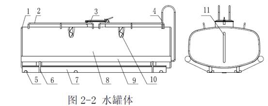 3、罐體 灑水車罐體結(jié)構(gòu),罐體為橢圓形或方形,用鋼板制成,整車罐體水倉為 2-3室,中間隔板下端有通孔,倉內(nèi)隔板具有防波作用。以減低汽車行駛時罐內(nèi)液體的沖擊。外表涂防銹漆 及裝飾漆。