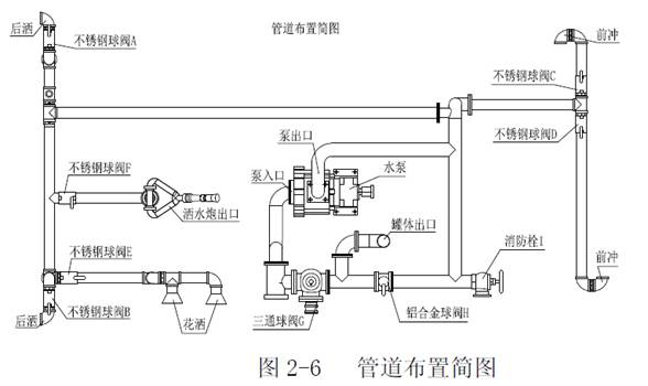 在灑水和澆灌花木時,其操作程序是:調(diào)節(jié)三通球閥G到如圖位置(注意:三通球閥凹坑所對方向關(guān)閉),關(guān)閉鋁合金球閥H和消防栓I,打開不銹鋼球閥A、B、C、D、E,打開鋁合金球閥H,踏下離合,打開取力器開關(guān),慢慢松開離合(千萬不可過快,否則將會損壞取力器或變速箱),使水泵開始工作,即可向?qū)崿F(xiàn)灑水和澆灌花木的功能,停止工作后開關(guān)