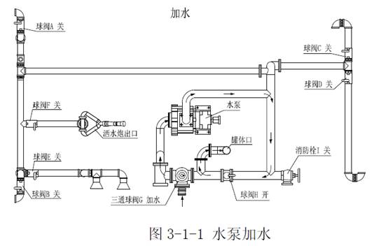 當(dāng)在野外自采水的情況下,水能通過水泵給罐內(nèi)供水,其操作程序是:在三通球閥G處接一膠管,調(diào)節(jié)三通球閥G到如圖位置(注意:三通球閥凹坑所對方向關(guān)閉),關(guān)閉不銹鋼球閥A、B、C、D、E、F和消防栓I,打開鋁合金球閥H,踏下離合,打開取力器開關(guān),慢慢松開離合(千萬不可過快,否則將會損壞取力器或變速箱),使水泵開始工作,即可向罐內(nèi)加水,停止工作后開關(guān)回位。