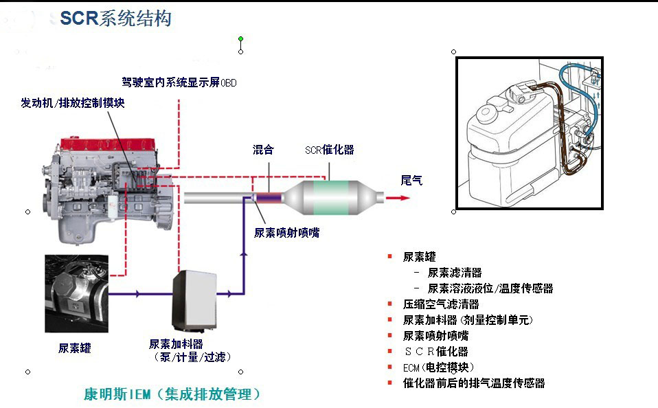 柴油發(fā)動機的排放是指發(fā)動機在工作過程中產(chǎn)生的有害氣體,主要有CH(碳氫化合物)、NOx(氮氧化物)、PM(微粒,碳煙)、CO(一氧化碳)為主。國3靠提高發(fā)動機噴油壓力,提高燃料的燃燒充分性,可以降低多數(shù)有害氣體的排放水平。但是高溫、高壓易導致NOx(氮氧化物)排放物的提升,國4需引入發(fā)動機機外凈化技術(shù)。國Ⅳ階段必須應用一種后處理技術(shù),就是使用排氣后處理技術(shù)來控制排放。國際上,絕大部分發(fā)動機制造商在改進歐Ⅲ發(fā)動機的基礎(chǔ)上,再加上SCR或EGR+DOC+DPF等后處理系統(tǒng)來實現(xiàn)的。