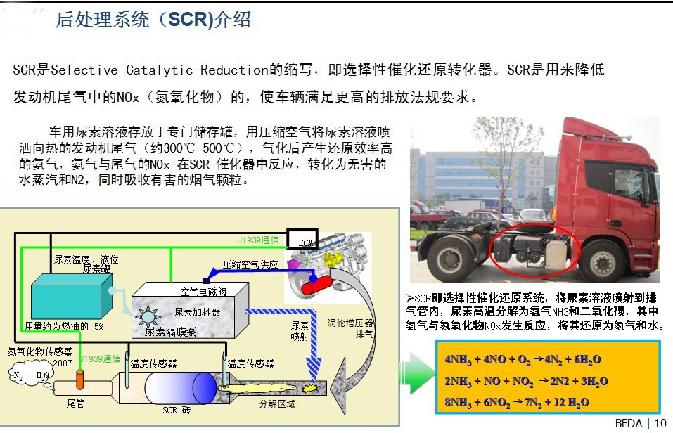 電控+SCR技術(shù)是通過使用選擇性催化還原(SCR)技術(shù),利用尿素溶液對尾氣中的氮氧化物進行處理。車用尿素溶液存放于專門儲存罐,用壓縮空氣將尿素溶液噴灑向熱的發(fā)動機尾氣(約300℃-500℃),氣化后產(chǎn)生還原效率高的氨氣,氨氣與尾氣的NOx 在SCR 催化器中反應,轉(zhuǎn)化為無害的水蒸汽和N2,同時吸收有害的煙氣顆粒;SCR即選擇性催化還原系統(tǒng),將尿素溶液噴射到排氣管內(nèi),尿素高溫分解為氨氣NH3和二氧化碳,其中氨氣與氮氧化物NOx發(fā)生反應,將其還原為氮氣和水。