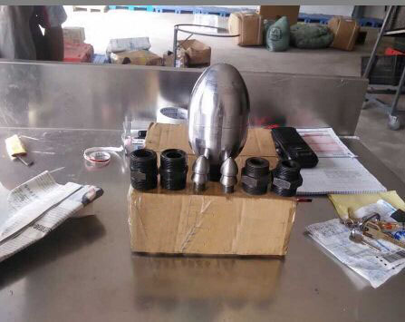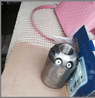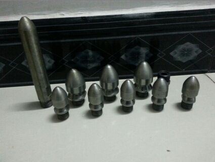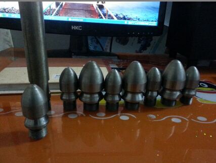 除了直噴頭以外,每個噴頭都有向后的6個噴射孔(一邊穿透、破碎、攪拌堵塞物,一邊推動噴頭和耐高壓水管前進(jìn)),其中2、3、5、8號另外,還有一個前噴孔(穿刺堵塞物并作為導(dǎo)引孔)。
