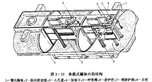 加油車的罐體與運油車的罐體相似,也具有運油車罐體的基本裝置。圖3-22為大型加油車罐體結構示意圖。橫向隔板1將罐體分成三個艙,每個艙內設有橫向防波板。罐體寬度較大時,可再設縱向防波板。2防護欄6和側防護架7是用來保護加油口,呼吸閥等不受意外碰傷,以免造成燃油外溢。大型罐體還可采用立柱8以提高罐體剛度。