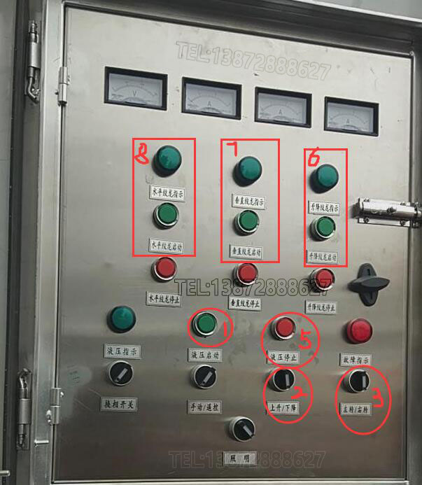 5、依次按下控制箱中的“升絞絞龍啟動(圖示6)”、“垂直絞龍啟動(圖示7)”、“水平絞龍啟動(圖示8)”按鈕,啟動卸料動作。