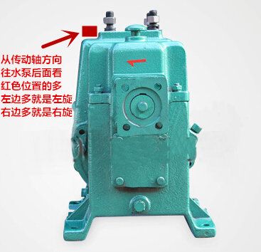 2、如果看不到灑水泵標牌,那么就按照張部長教的方法,從水泵傳動軸方向往后看,看看水泵上不進水口位置兩次多出來的空間,哪邊多,就是什么旋轉的,如下圖,左邊的空間多,那么就是左旋的。國內的灑水車水泵廠家,都可以這樣區分。